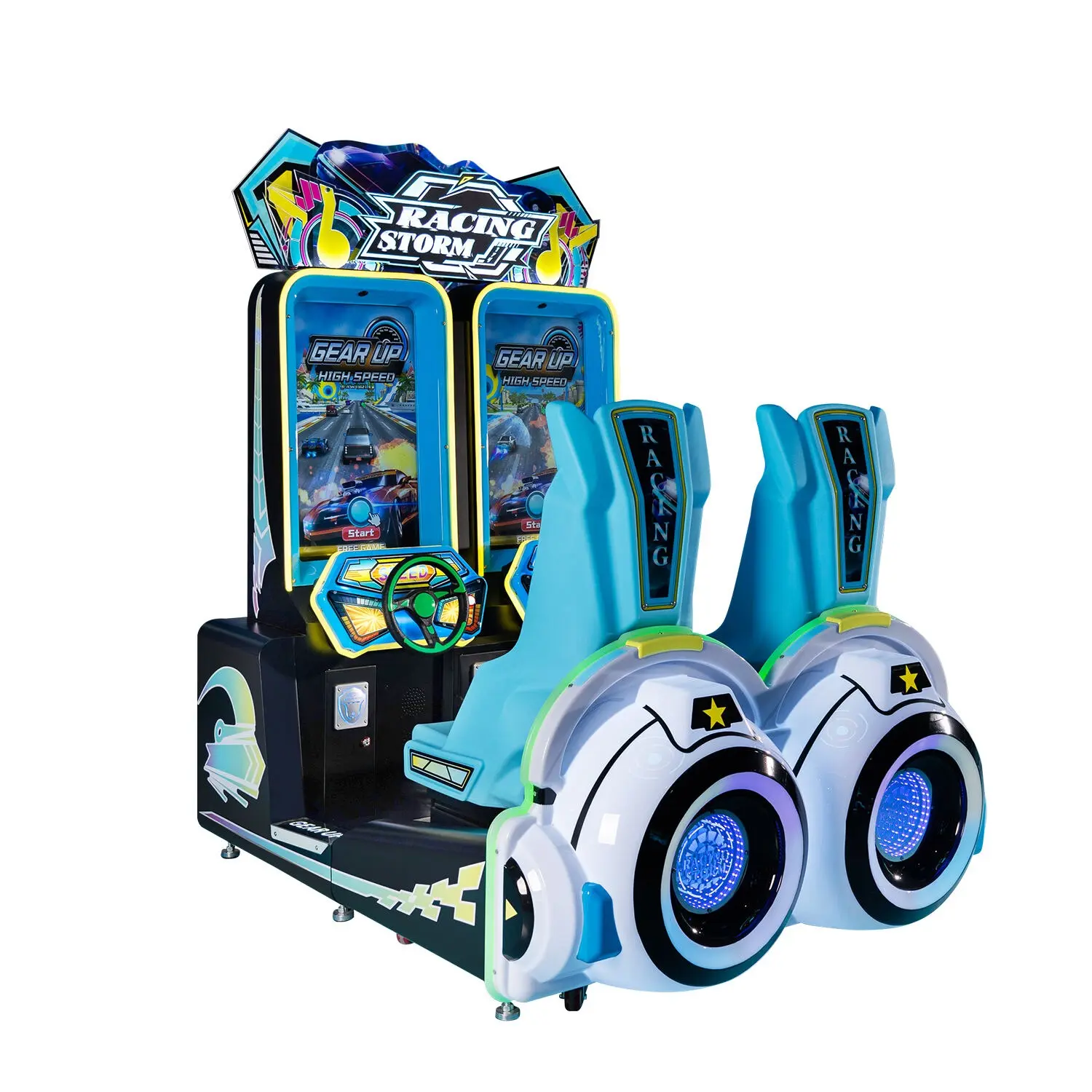 Модель оснащена двумя 30-дюймовыми HD-экранами, которые обеспечивают невероятно реалистичное ощущение от гонки. Игроки могут соревноваться друг с другом бок о бок на красочных трассах с интуитивным управлением и яркой графикой.