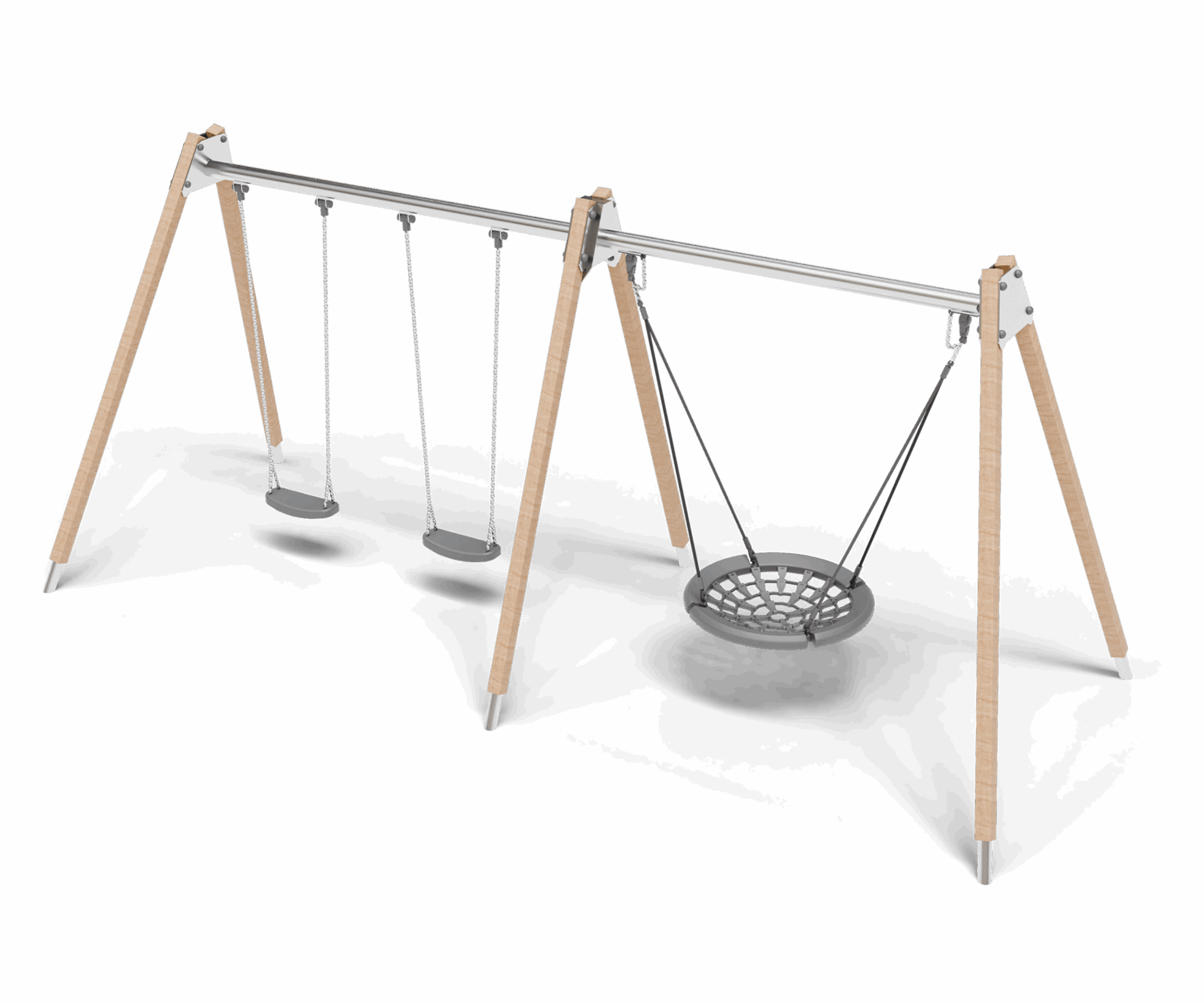 Этот МАФ соединяет в себе два вида качелей— обычные и “гнездо”. Всем хватит места! Оборудование полностью соответствует стандартам безопасности.