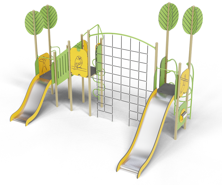 Детская площадка украшена кронами деревьев, создавая иллюзию игры в домике на дереве и придавая особый шарм этому пространству. Ребята с удовольствием будут исследовать и преодолевать препятствия, развивая координацию, силу и социальные навыки.