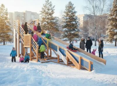 Зимняя деревянная горка “Интех-Аттра Snow Fox 12 м” две лестницы, без окраски