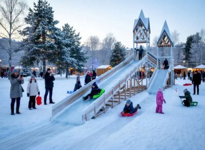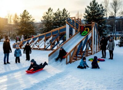 Зимняя деревянная горка “Интех-Аттра Snow Fox 12 м” с двумя скатами (две лестницы)